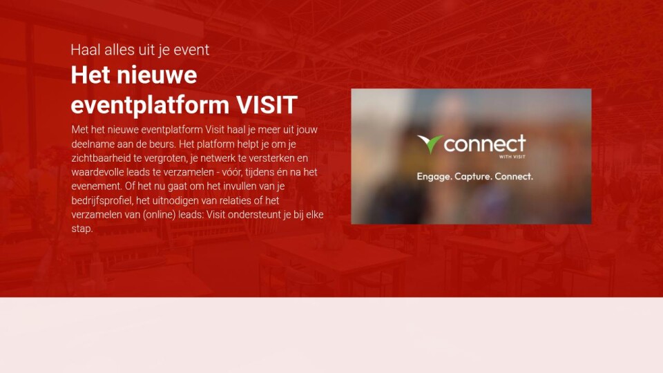 Met het nieuwe eventplatform Visit haal je meer uit jouw deelname aan de beurs. Het platform helpt je om je zichtbaarheid te vergroten, je netwerk te versterken en waardevolle leads te verzamelen - vóór, tijdens én na het evenement. Of het nu gaat om het invullen van je bedrijfsprofiel, het uitnodigen van relaties of het verzamelen van (online) leads: Visit ondersteunt je bij elke stap.