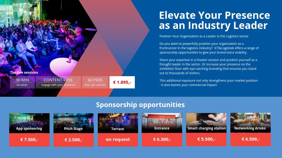 Do you want to powerfully position your organization as a frontrunner in the logistics industry? ICT&Logistiek offers a range of sponsorship opportunities to give your brand extra visibility.