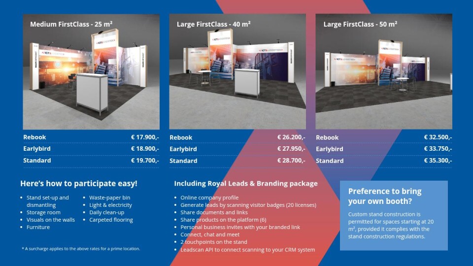 Custom stand construction is permitted for spaces starting at 20 m², provided it complies with the stand construction regulations.