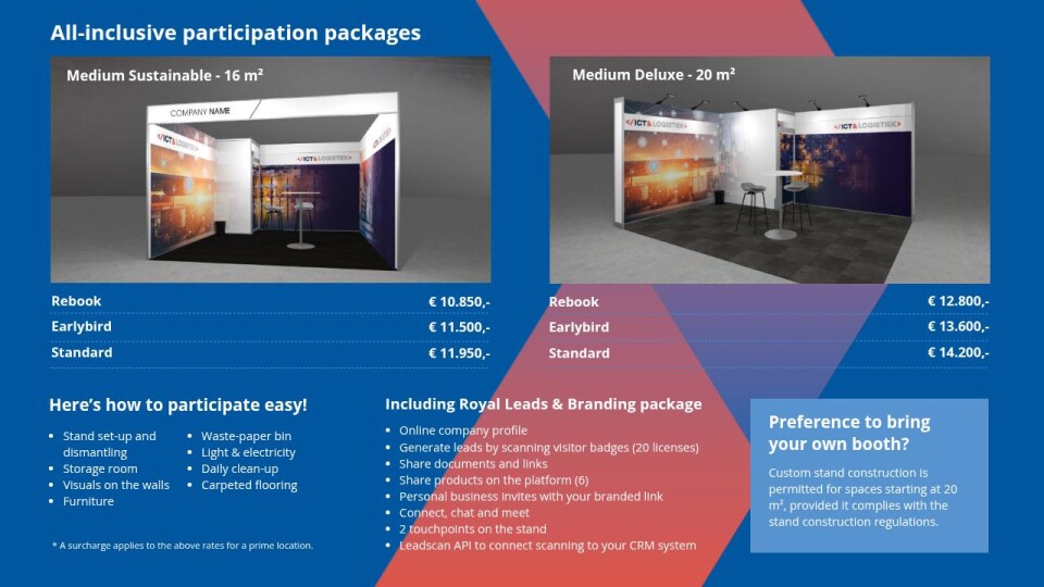 Custom stand construction is permitted for spaces starting at 20 m², provided it complies with the stand construction regulations.