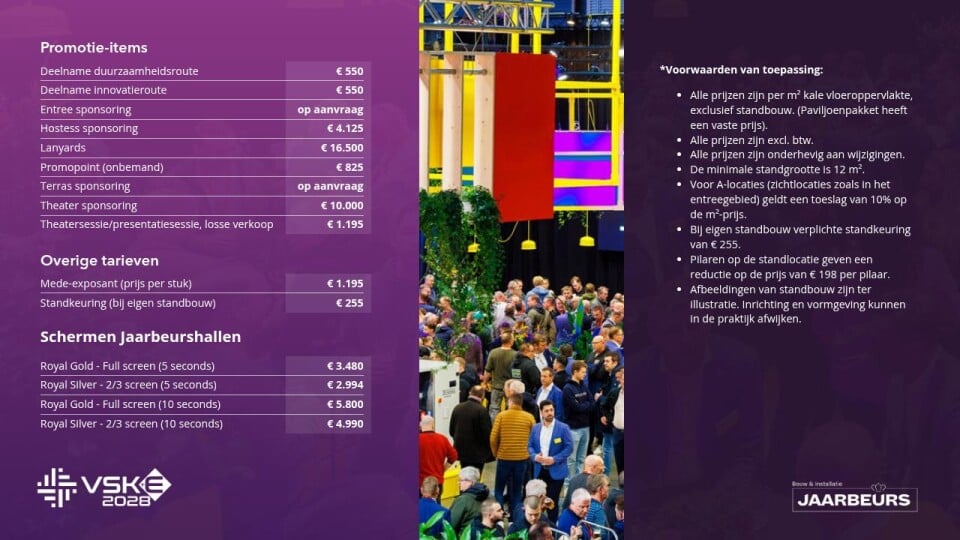 Alle prijzen zijn per m² kale vloeroppervlakte, exclusief standbouw. (Paviljoenpakket heeft een vaste prijs).