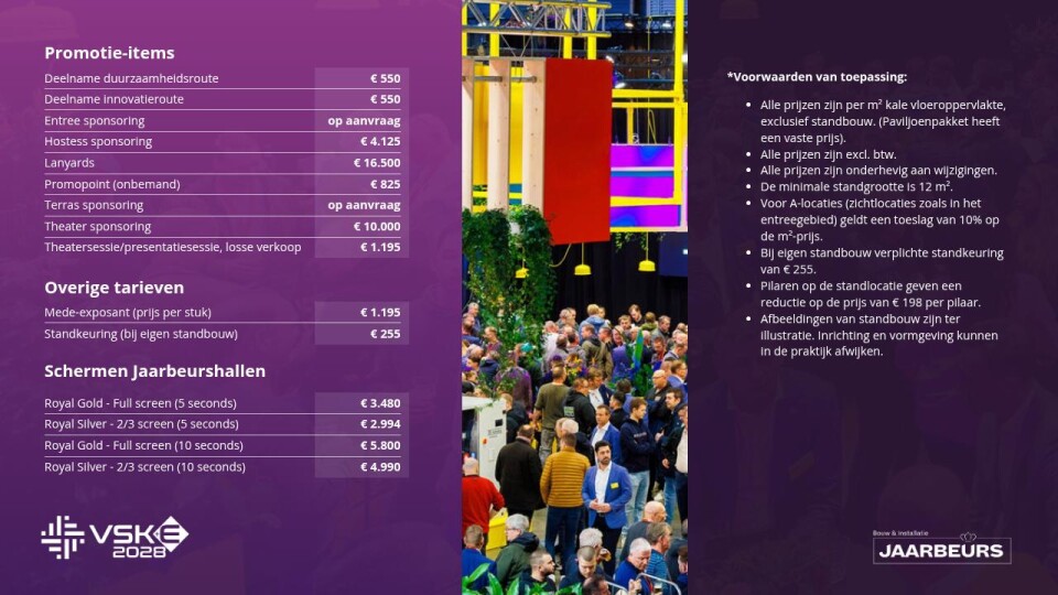 Alle prijzen zijn per m² kale vloeroppervlakte, exclusief standbouw. (Paviljoenpakket heeft een vaste prijs).