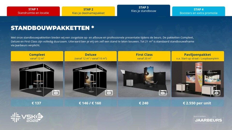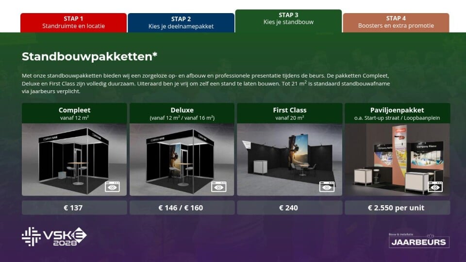 Met onze standbouwpakketten bieden wij een zorgeloze op- en afbouw en professionele presentatie tijdens de beurs. De pakketten Compleet, Deluxe en First Class zijn volledig duurzaam. Uiteraard ben je vrij om zelf een stand te laten bouwen. Tot 21 m2 is standaard standbouwafname via Jaarbeurs verplicht.